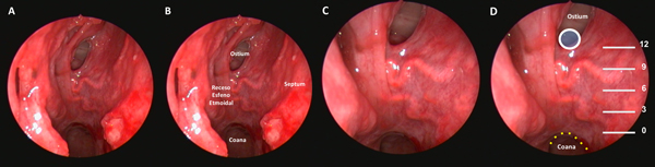 Se introduce en la fosa nasal derecha una óptica endoscópica de cero grados, de 175 mm de longitud y 4 mm de diámetro. Se identifican de rutina las principales referencias anatómicas: el cornete inferior hacia lateral, el septum nasal hacia medial y el techo de la coana hacia posterior e inferior. La visualización del ostium esfenoidal es inconstante, ya que puede estar oculto por la mucosa o el cornete superior.