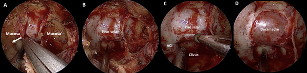 Figura 4. Tiempo intrasinusal. A-D: exposición de la duramadre selar.