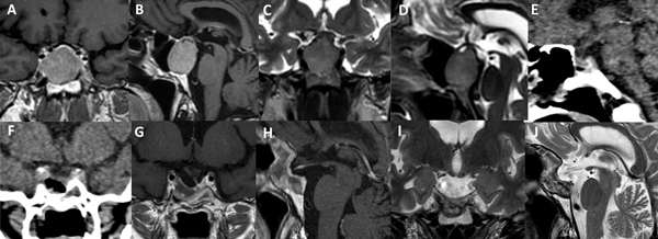 Figura 5. Paciente de 45 años con prolactinoma infradiafragmático resistente a cabergolina. Se utilizó un abordaje de Guante Blanco para su tratamiento. A-D: RM preoperatoria. E-F: TC del primer día postoperatorio. G-J: RM postoperatoria.