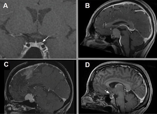 Figura 1. Lesiones selares más frecuentes. A: Adenoma hipofisario. B: Craneofaringioma. C: Meningioma del tuberculum selar. D: Quiste de la bolsa de Rathke