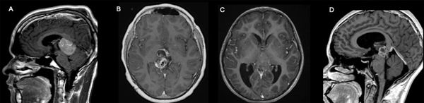 Figura 1. Tipos Tumorales más frecuentes. A: Germinoma. B: Teratoma. C: Pineoblastoma. D: Tumor papilar.