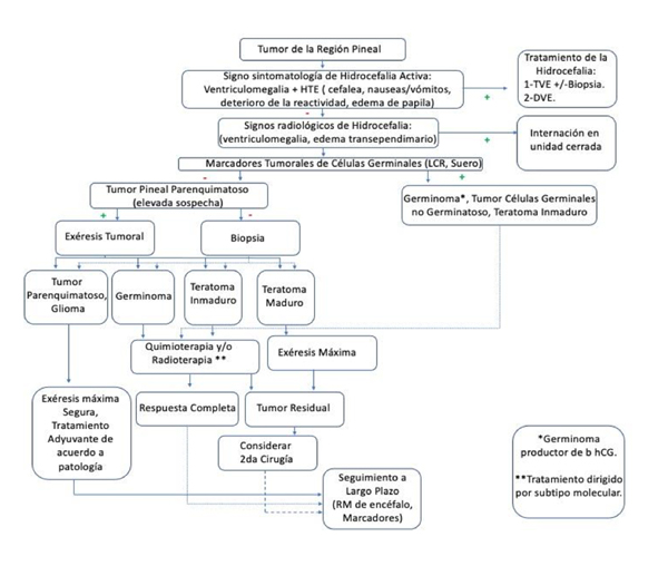 Los pacientes pediátricos con tumores en la región pineal presentan características exclusivas, ya que la información obtenida de los marcadores en suero o en líquido cefalorraquídeo (LCR) y el análisis tisular determinan el ulterior tratamiento, que no necesariamente requiere la exéresis tumoral. (Tabla 2). El tratamiento de la hidrocefalia y el diagnóstico tumoral etiológico presentan objetivos diferenciales y, sin embargo, relacionados ya que pueden llevarse a cabo mediante la Tercer Ventriculostomía Endoscópica (TVE).