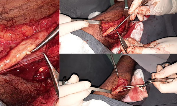 Al tener el nervio expuesto, se vio que este estaba engrosado y se constató la salida de líquido caseoso del nervio. Se realizó epineurotomía amplia en el trayecto expuesto y hasta encontrar nervio con aspecto normal. Posteriormente se realizó el cierre de planos de cubierta.