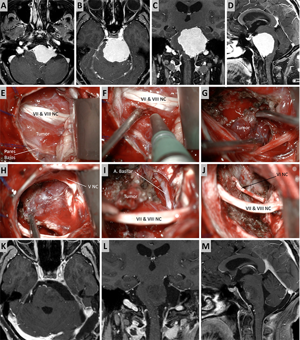 Figura 5. Caso ilustrativo #3. A-D. Resonancia que muestra MRPC con implantación clival. E-J. Se realiza un abordaje retrosigmoideo, consiguiendo la liberación del complejo VII-VIII del tumor y su resección completa. K-M. Resultado imagenológico postquirúrgico.