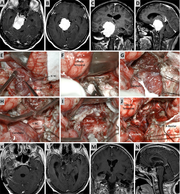Figura 7. Caso ilustrativo #5. Resonancia que muestra MRPC con implantación petroclival y extensión a la fosa media. Paciente con audición conservada. A-D. Se presentan las imágenes prequirúrgicas, corte axial, coronal y sagital. E. Se realizo un abordaje presigmoideo combinado con un abordaje subtemporal. Se logro una visión directa del tumor, desde la región del clivus medio hasta la fosa media. F. Se observa una resección tumoral del clivus medio y fosa media casi total. G. Lesion tumoral en clivus medio. H-J. Resección casi total del tumor. La retracción del lóbulo temporal fue necesaria para tener mayor visibilidad de la incisura tentorial. K-N. RMN posquirúrgica donde se observa una resección quirúrgica casi total.