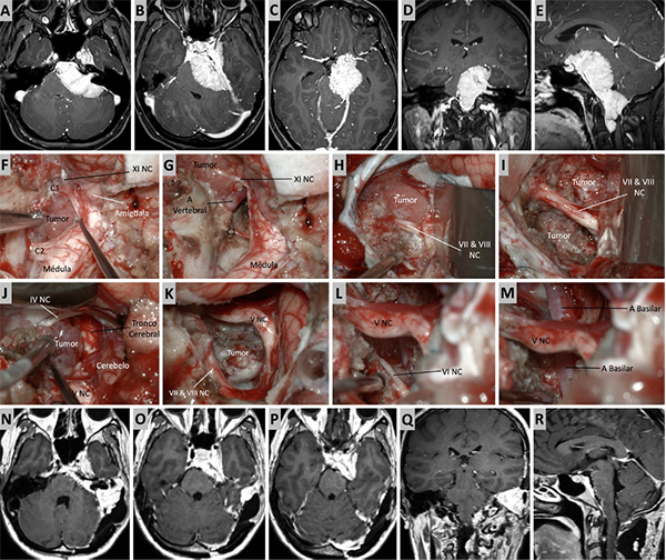 Figura 10. Caso ilustrativo #8. MRPC con implantación petroclival con invasión con extensión a la fosa media, clivus inferior, agujero magno y región premedula. Paciente con anacusia izquierda. A. Se observa un corte axial. MPC con extensión al ángulo pontocerebeloso y compromiso del CAI. B. Se observa extensión del tumor a la fosa media, seno cavernoso y ala mayor del esfenoides. C. Se observa extensión del tumor a ala menor del esfenoide, cisterna silviana y optocarotidea.D-E. Extensión del tumor a la fosa media, al clivus inferior y a la región premedular. Se realizo un abordaje presigmoideo acompañado de un abordaje far-lateral y un abordaje retrosigmoideo. F. Se observa la porción tumoral ubicada en el foramen magno y la región premedular, fue necesario un abordaje far-lateral. G. Resección completa de la porción ubicada en foramen magno y región premedular. H. Porción tumoral que se extiende desde clivus inferior a clivus medio. I-J. Resección de tumor de clivus medio e inferior. K. Porción tumoral en clivus superior con extensión a fosa media. Se realizo un abordaje transpetroso anterior para esta región. L-M. Resección casi total. N-R. Imágenes postquirúrgica que muestran una resección casi total.