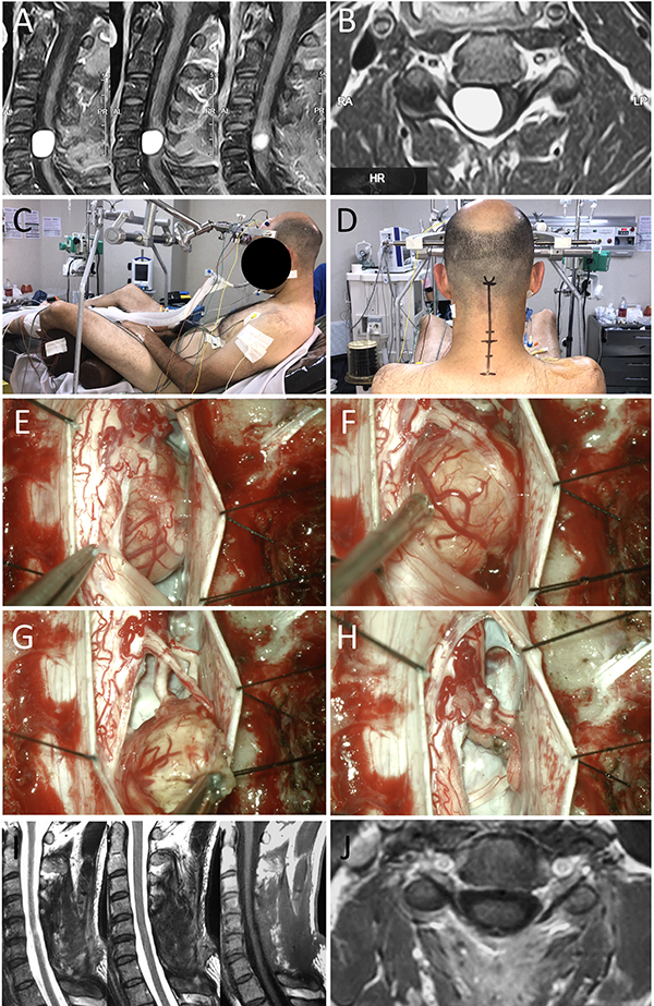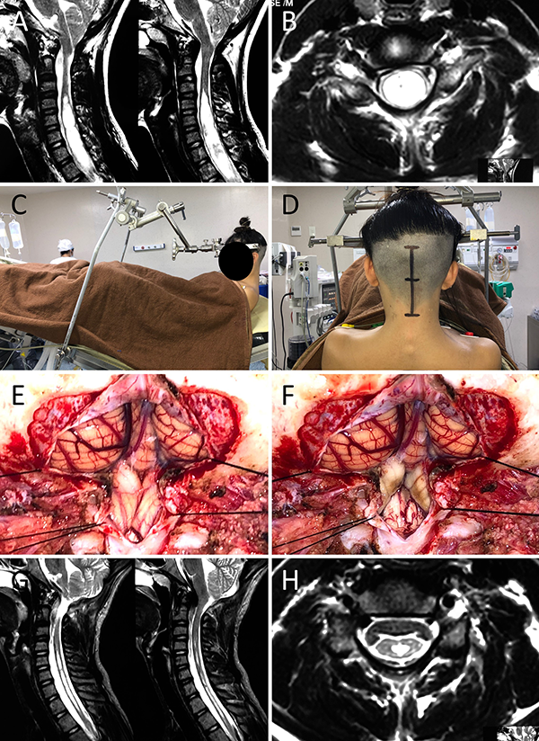 Neurinoma intradural extramedular cervical. A-B: RM preoperatoria; C-D: Posición; E-H: Hallazgos intraoperatorios.