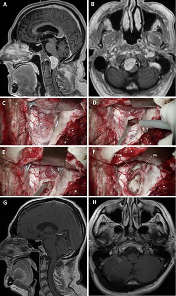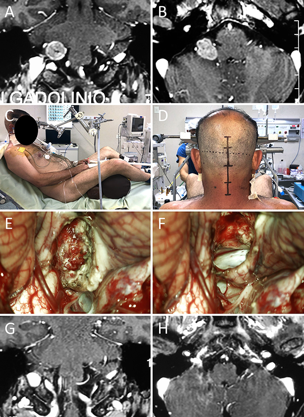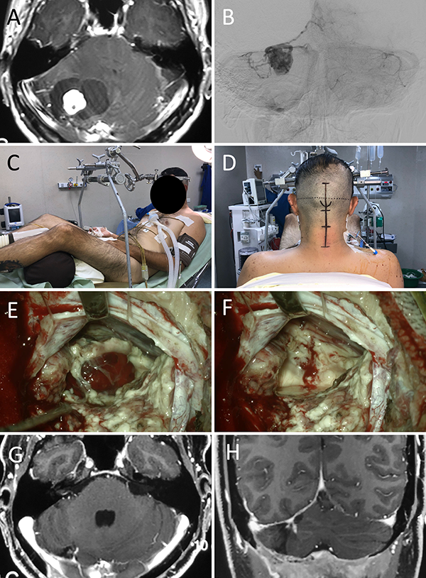 Meningioma del foramen magno. A-B: RM preoperatoria; C-F: Hallazgos intraoperatorios; G-H: RM postoperatoria.
