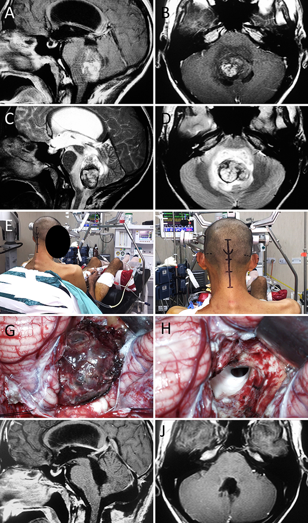 Méduloblastoma de IV ventrículo. A-D: RM preoperatoria; E-F: Posición; G-H: Hallazgos intraoperatorios. I-J: RM postoperatoria.