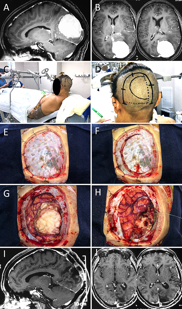 Meningioma del 1/3 posterior de la hoz. A-B: RM preoperatoria; C-D: Posición; E-H: Hallazgos intraoperatorios; I-J: RM postoperatoria.