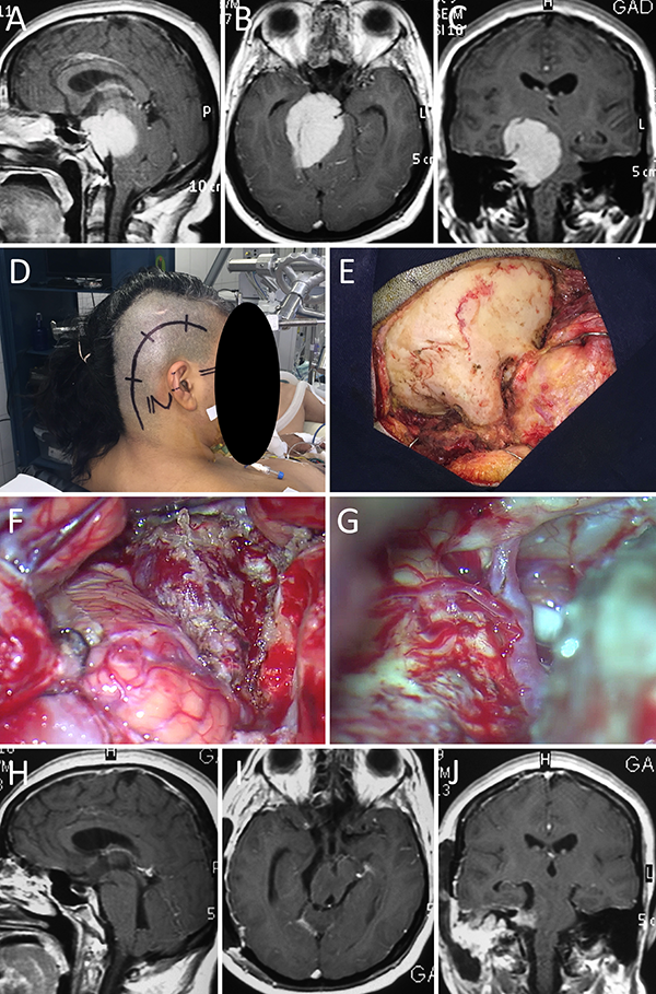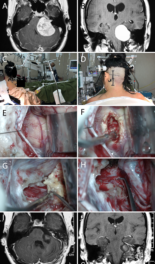 Meningioma petroclival derecho. A-C: RM preoperatoria; D: Posición. E: Exposición del plano óseo; F-G: Hallazgos intraoperatorios; H-J: RM postoperatoria.