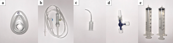 El SiRAMa está compuesto por: (1) una máscara facial de anestesia pediátrica, (2) una porción de una guía de suero, (3) una llave de 3 vías, y (4) dos jeringas de 60 ml (Fig. 1). La máscara de anestesia pediátrica debe ser maleable para ajustarse al cráneo del paciente y además ser transparente para visualizar el mismo durante el procedimiento. El montaje del dispositivo requiere conectar el orificio de ventilación de la máscara de anestesia pediátrica a la porción de la guía de suero, éste a la llave de 3 vías y ésta a las dos jeringas (Fig. 2).