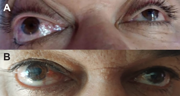 Figura 1. Fotografía previa al tratamiento que evidencia la quemosis del ojo derecho (a). Fotografía 6 meses posterior al tratamiento que muestra el ojo derecho sin inyección conjuntival (b).