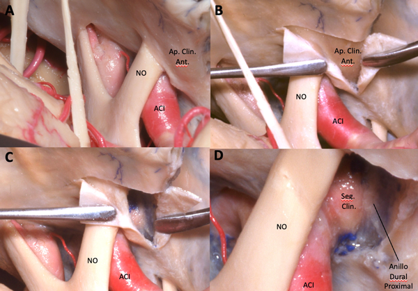 Figura 2. Clinoidectomía anterior intra dural. A: Vista supero lateral de la región supra selar. Se evidencia el nervio óptico, la carótida interna y la apófisis clinoides anterior con su recubrimiento dural. B: Se ha realizado la remoción de la duramadre sobre la apófisis clinoides anterior. C: Se completó una clinoidectomía anterior intra dural; se evidencia la pared lateral del seno cavernoso. D: Vista ampliada del segmento clinoideo de la carótida interna posterior a la clinoidectomía. Abreviaturas: ACI (arteria carótida interna), NO (nervio óptico), Ap. Clin. ant. (apófisis clinoides anterior), Seg. Clin (segmento clinoideo de la ACI)