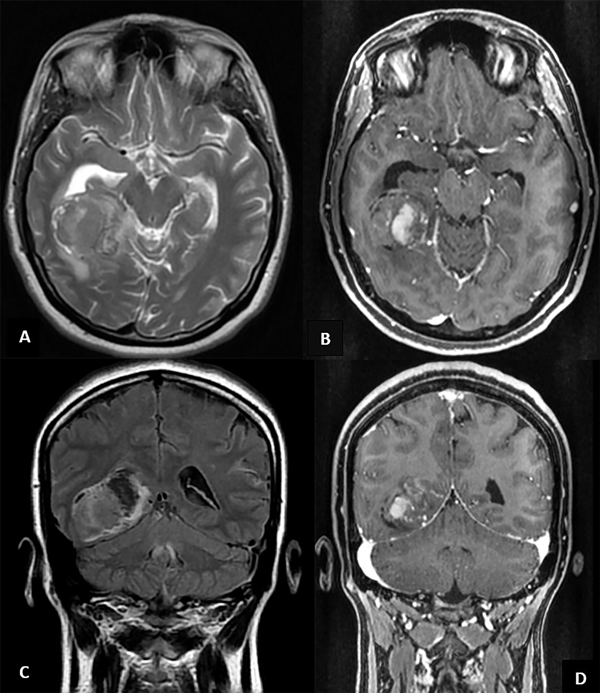 Figura 1. A) Corte axial en T2, se observa una masa temporal paraventricular derecha, irregular, con efecto de masa moderado. B) Corte axial en T1 con contraste. Obsérvese la captación heterogénea del gadolinio. C) Corte coronal en FLAIR. D) Corte coronal en T1 con gadolinio.