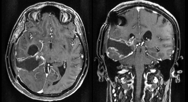 La paciente regresa por guardia 48 horas después de la primera consulta por persistencia de los síntomas. Se realiza inicialmente una tomografía computada (TC), donde se observa una lesión ocupante de espacio de tamaño moderado, con signos de probable hemorragia intralesional y restos de sangre en cuerno temporal derecho. Se da aviso al servicio de neurocirugía debido a los hallazgos por imágenes y se efectúa una resonancia magnética (RM) (Figura 1).