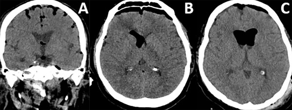 Figura 3. Neumoencéfalo ventricular. A) Leve. B) Moderado. C) Severo.