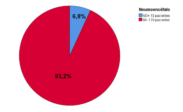 Con respecto al resultado neurológico a los 30 días postquirúrgicos según la escala de GOS se observó que la mayoría 68.7% (n = 132) era normal, 16.7% (n = 32) tenían déficit moderado, 5.7% (n = 11) déficit severo, y solo el 1.6% (n = 3) estaba en estado vegetativo y el 7.3% (n = 14) falleció. No hubo diferencias significativas en el resultado neurológico a los 30 días postquirúrgicos entre los que presentaron, o no, neumoencéfalo (p = 0.23).