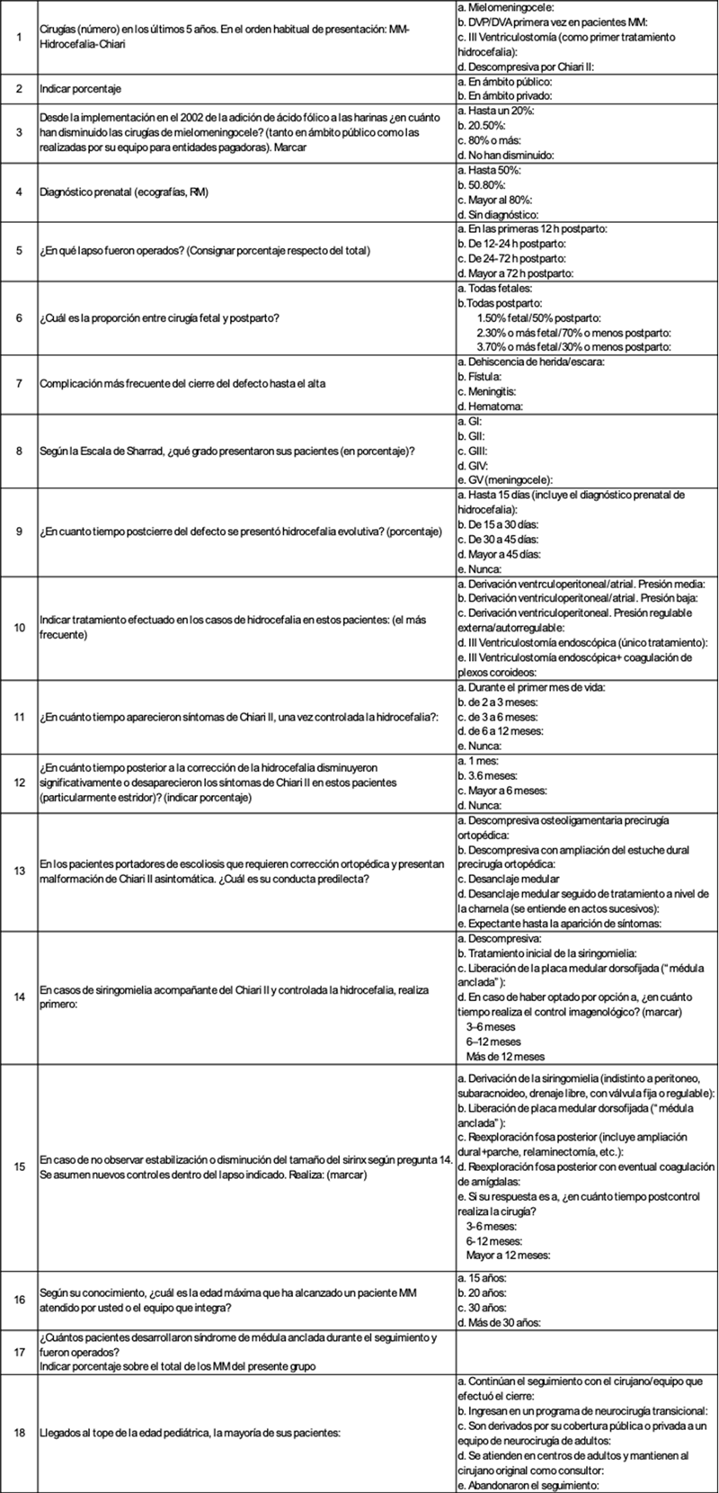 Resultados: recibimos 15 cuestionarios: 10 completos, 5 incompletos. La incidencia de MM desde 2003 disminuyó en 20-50% para el 42.9% y más del 80% para el 21.4% de los encuestados. De 413 cirugías postparto, el 72.8% se efectuaron entre 12-48 horas; 62 mediante cirugía fetal, alrededor de la semana 28.5. La principal complicación fue la fístula: 42.7%. Se implantaron 314 derivaciones ventriculoperitoneales (DVP), 81.7% desde el nacimiento hasta los 30 días. Chiari sintomático tratado mediante descompresiva occipitocervical (DOC): 73 casos, con dos picos, en el primer mes de vida (27.6%) y 3-6 meses (24.1%). El 57.1% de los pacientes conocidos sobrevivió 20 años o más.