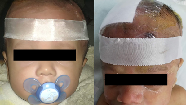 Se realizó un estudio descriptivo-retrospectivo, entre enero de 2018 y diciembre de 2020, en pacientes menores de un año con diagnóstico de hidrocefalia, tratados con TVE en el Hospital de Niños “Sor María Ludovica” de La Plata, Buenos Aires, Argentina, a los cuales se les colocó en el postoperatorio inmediato una banda de contención adhesiva, inextensible, de 2.5 cm de ancho, pasando por encima del reborde orbitario hasta el inion, la que se recambiaba cada 7 días durante 3 meses (Figura 1).