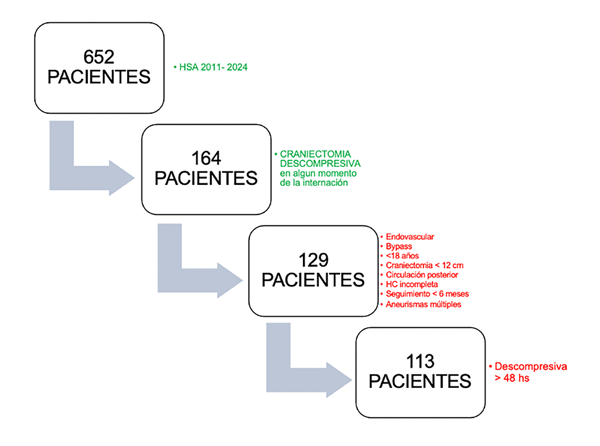 Se realizó un análisis observacional retrospectivo y analítico de los pacientes con HSA admitidos en nuestro centro entre 2011 y 2024. De ellos, se incluyeron aquellos tratados con clipado microquirúrgico que requirieron craniectomía descompresiva en algún momento de su internación. Se excluyeron pacientes tratados por vía endovascular, con bypass cerebral, aneurismas de circulación posterior y casos con craniectomía menor a 12 cm.