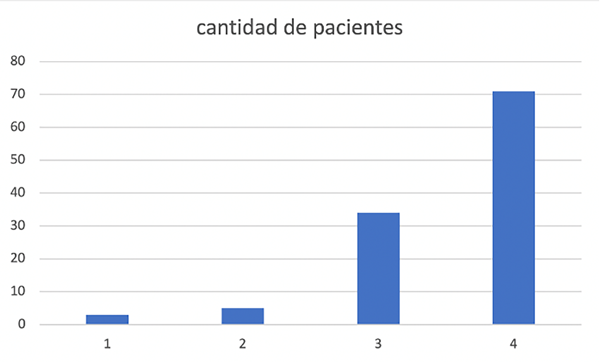 Con respecto a la clasificación de Fisher modificada, 3 pacientes obtuvieron 1 punto, 5, 2 puntos; 34 pacientes 3 puntos y 71, 4 puntos (Figura 2).