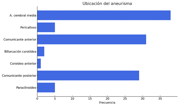 La ubicación más frecuente del aneurisma responsable de la hemorragia subaracnoidea fue la arteria cerebral media (35%), seguida del comunicante anterior (28%), comunicante posterior (26%), pericalloso y paraclinoideo (4%), bifurcación carotídea (2%), y coroideo anterior (1%) (Figura 3).