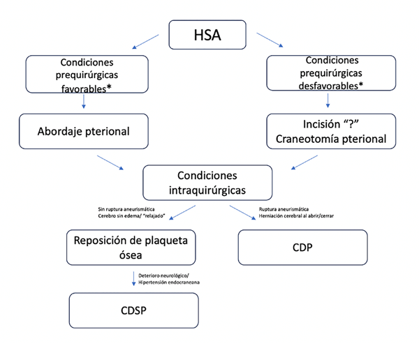 Figura 4. Diagrama de flujo. *Condiciones prequirúrgicas favorables: buen grado neurológico, clasificación de Fisher-m 1 o 2, escaso tiempo desde el sangrado y resolución previa al período de vasoespasmo, deterioro neurológico atribuible a otra causa corregible por otro abordaje, por ejemplo, hidrocefalia. *Condiciones prequirúrgicas desfavorables: mal grado neurológico, clasificación de Fisher-m 3 o 4, resolución durante el período de vasoespasmo, ausencia de otra causa del deterioro corregible por otro abordaje.