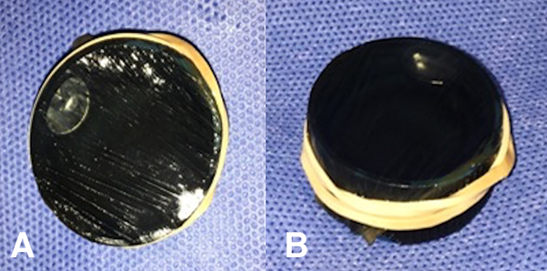 Figura 2: Membrana amniótica. A) La imagen muestra el resultado final de la membrana amniótica envolviendo la tapa de gaseosa, se puede observar por translucencia que se encuentra llena de líquido. B) En la visión lateral se puede observar la tapa de gaseosa sujetada con una banda elástica