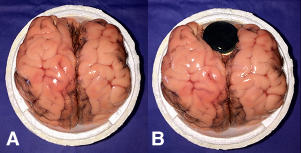 Figura 3: Recipiente de poliestireno expandido. A) La imagen muestra el cerebro bovino colocado dentro del recipiente. B) Resultado final luego de colocar el cerebro bovino junto con la tapa con membrana amniótica.