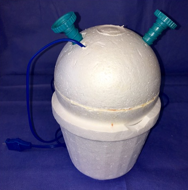 El modelo consiste en la utilización de un cerebro bovino (de preferencia utilizar la pieza completa) (fig. 1) y de pequeñas unidades de membrana amniótica, que se colocan envolviendo las tapas de botellas de plástico, para permitir la fenestración y dilatación de la misma (fig. 2 a-b). Éstas se disponen dentro de un recipiente esférico de poliestireno expandido (fig. 3 a-b), el cual se fenestra en la parte superior para permitir el ingreso del endoscopio. Para poder utilizar el monopolar debe colocarse dentro del recipiente el terminal del cable, que proviene de la consola, directamente en contacto con el tejido cerebral (fig. 4). Finalmente cerramos la esfera de poliestireno expandido y la llenamos por completo con solución fisiológica o agua corriente (fig. 5).