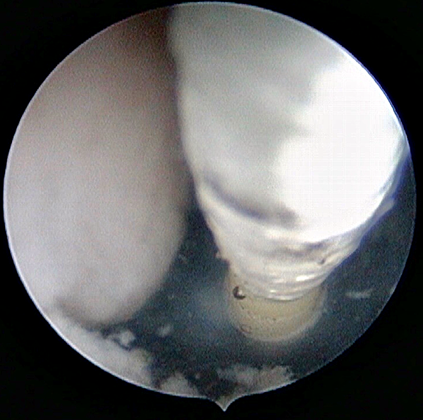 Figura 7: Imagen endoscópica del ejercicio de fenestración de membrana que simula una tercer ventriculostomía endoscópica.