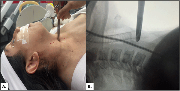 Figura 2. Marcación. A) Colocación de elemento radioopaco perpendicular al suelo. B) Guía radioscópica en incidencia de perfil.