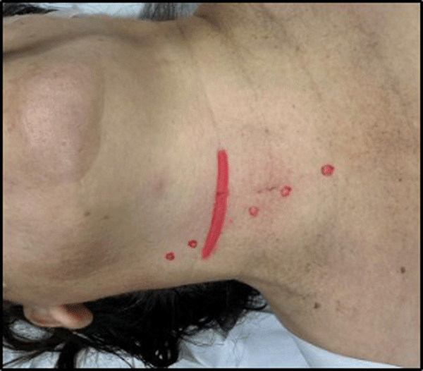 Figura 3. Incisión. Línea punteada: borde anterior del músculo esternocleidomastoideo. Línea continua: incisión horizontal sobre pliegue cutáneo centrada en marcación radioscópica previa.