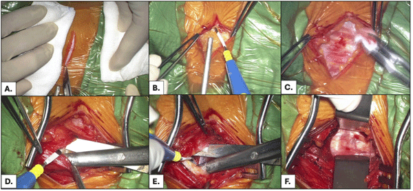 Figura 9. Resección del LVCP. A y B) Disección del ligamento. C) Resección del ligamento con Kerrison, se observa en profundidad color perlado de la duramadre.