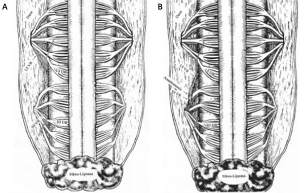 A-B) Esquema que muestra la atípica disposición de las raíces a nivel lumbusacro de los pacientes con disrrafismos como el mielomeningocele. A: del lado derecho se observa las raíces dorsales de L5 y S1. B: anatomosis con injerto entre raíces ventrales de L5 y cabo distal de la raíz ventral de S3 (Gentileza Dr. Xiao).