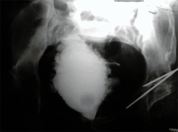 Paciente de sexo femenino de 34 años de edad con MMC Grado 3. Defecto del tubo neural corregido a las 6 horas de vida e hidrocefalia tratada con una derivación ventriculoperitoneal a los 12 meses de vida. No efectuaba cateterismo. Urograma excretor: normal. Incontinencia fecal y urinaria. Siempre uso pañales. A los 22 años de edad se realizó cistografía retrógrada con resultado patológico (fig. 2).