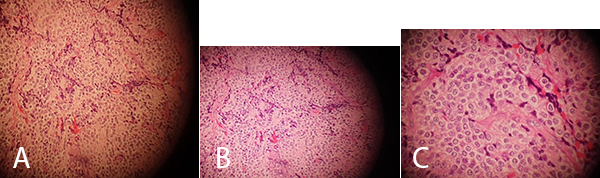 Figura 2. Placas histopatológicas de NC teñidas con hematoxilina-eosina. A: Neurocitoma, células claras. B y C: Infiltración incluyendo células redondas uniformes. Se evidencia proliferación de células monótonas redondas, sin atipia citológica y sin mitosis observable; las células están intercaladas con vasos sanguíneos capilares y focalmente presenta estructuras con apariencia de rosetas y calcificación distrófica focal.