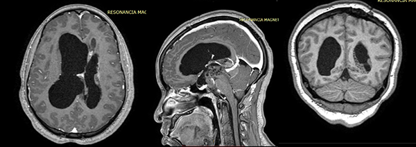 Se trata de una paciente afroecuatoriana de 22 años con un cuadro de 3 años de evolución de cefalea holocraneana acompañada de fonofobia y fotofobia que 6 meses atrás se exacerba con compromiso del estado de consciencia y crisis convulsivas esporádicas. Se realizó electroencefalograma (EEG) en el cual se obtiene lentitud focal intermitente y ondas Theta con algunos paroxismos asociados a la región temporo-parietal izquierda. En la Resonancia Magnética (RM) contrastada de cerebro se evidenció una lesión intraventricular bilateral con predominancia izquierda de gran tamaño, rodeada de importante edema perilesional. (Figura 1)
