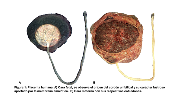 La placenta humana (del latín torta plana) es un órgano endocrino discoide de carácter transitorio. Pesa 470 g aproximadamente y posee un diámetro de 22 cm y un espesor central de 2,5 cm.1,2 Presenta dos caras. Macroscópicamente se reconoce la cara fetal por ser lustrosa, característica que surge de la aposición de la membrana amniótica y la visualización del cordón umbilical (fig. 1A). La cara materna puede o no presentar tabiques y cotiledones (fig. 1B).3 Las estructuras vasculares tienen una extensión promedio de 87 cm.4 El espesor arterial promedio es de 2.6-5.9 mm y el venoso de 4.2-10.2 mm.5 El cordón umbilical posee dos arterias y una vena central. En su extensión aproximada de 50 cm se pueden apreciar pseudonudos generados por la presión del flujo circulatorio.