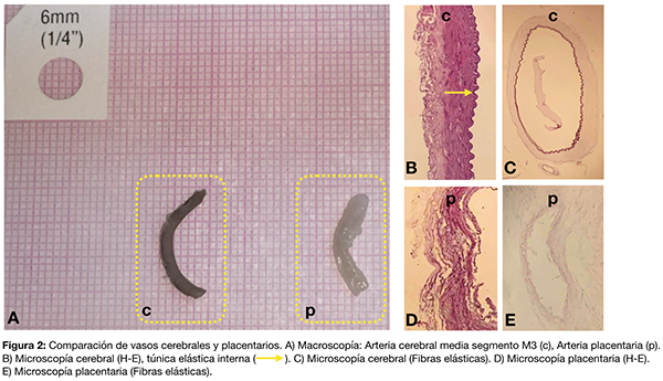 Desde el punto de vista macroscópico los vasos placentarios poseen un diámetro global mayor y una pared de menor diámetro que los cerebrales (fig. 2A). Estos últimos poseen una pared relativamente fina ya que se encuentran dentro del cráneo resguardados de las presiones y estiramientos exteriores. Mediante técnicas de microscopía óptica (H-E, fibras elásticas) se constata una elástica interna bien desarrollada a diferencia de la túnica media (fig. 2 B-C). Los vasos placentarios prácticamente no poseen elástica interna y por otro lado no presentan marcadores histológicos que permitan la diferenciación entre arterias y venas (fig. 2 D-E). Una de las explicaciones de este fenómeno es que la determinación de convertirse en un vaso arterial o venoso es dependiente de la exposición a la presión sanguinea.6