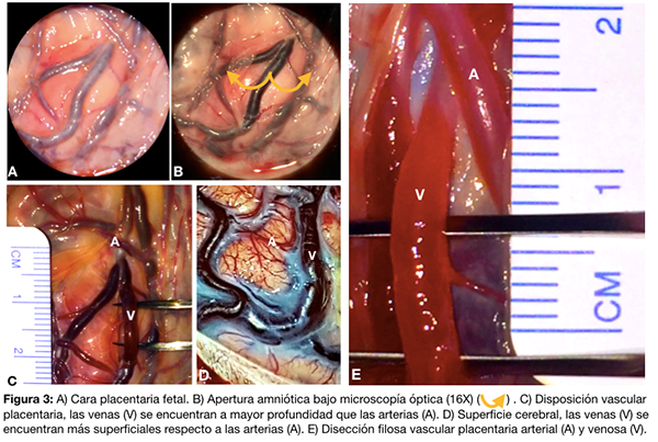 Se realizó disección roma y filosa de vasos placentarios con instrumental microquirúrgico bajo microscopia óptica (fig. 3 A-B-E). Se constató la diferencia en la disposición vascular placentaria respecto a las estructuras vasculares cerebrales (fig. 3 C-D).