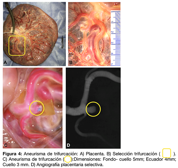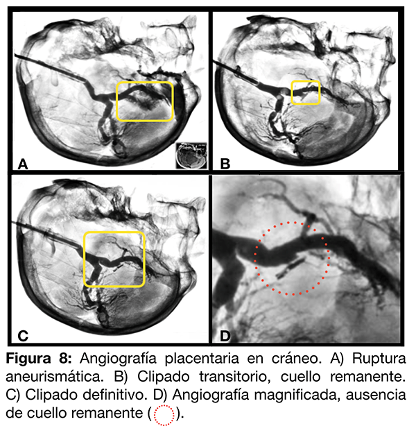 Se realiza un cateterismo placentario del vaso arterial madre del cordón umbilical mediante un catéter guía 6F fijado con una ligadura de lino n°60. Se procede a la inyección de contraste iodado diluido al 70% donde se observa la conformación vascular arterial y el aneurisma con la respectiva fuga de contraste (fig. 8 A). El cateterismo permite verificar un clipado aneurismático inadecuado, con un cuello remanente (fig. 8 B) y su corrección (fig. 8 C-D).
