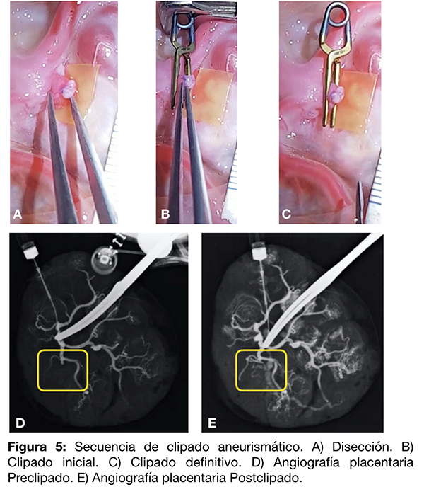 Se continua con la secuencia del clipado aneurismático realizando disección filosa de ambas axilas y el clipado del mismo (fig. 5 A-B-C). Se realiza posterior control angiográfico verificando la ausencia de relleno del saco aneurismático y la posición adecuada del clip (fig. 5 D-E).