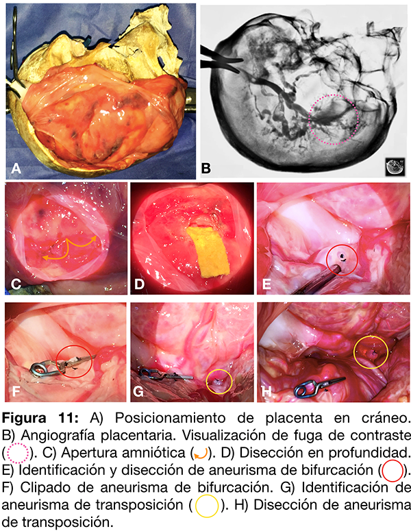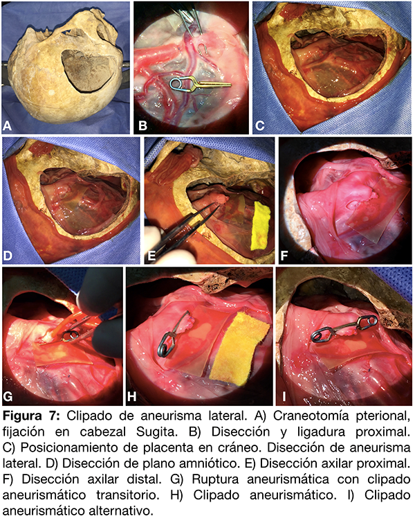 Mediante la utilización de una bomba de infusión continua se pudo simular la pulsatilidad del flujo sanguíneo para mayor representatividad del escenario quirúrgico y practicar clipado aneurismático con y sin ruptura.9,10 El posicionamiento de la placenta en cráneo y fijación con cabezal Sugita® permite la apertura amniótica mediante el microscopio quirúrgico como ejercicio de disección silviana. A su vez el trabajo en profundidad, utilizando la pinza bipolar y la aspiración continua para la inspección, disección y clipado de los aneurismas generados, reproduce en forma realista el manejo de la patología aneurismática.7,11
