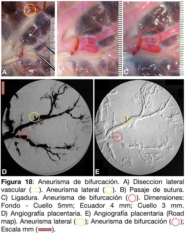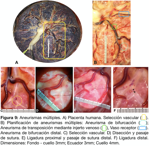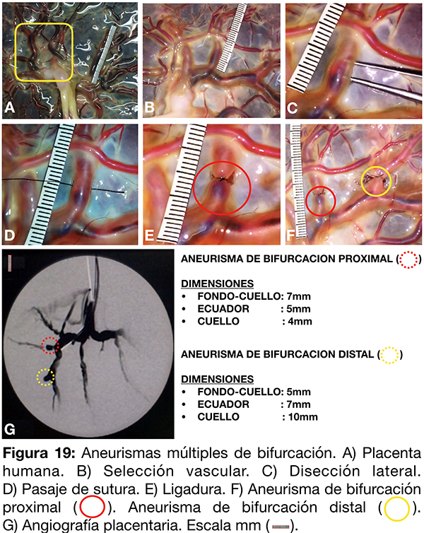 Se selecciona un territorio arterial de la placenta para la generación de múltiples aneurismas de bifurcación (fig. 19 A-B). Tras disecar la membrana amniótica con micro tijera, se disecan en forma filosa las caras laterales vasculares y se prosigue con la región infra vascular (fig. 19 C). Se practican ligaduras con nylon 8-0 conformando los aneurismas de bifurcación proximal y distal (fig. 19 D-E-F). Finalmente se cateterizan los vasos arteriales mediante catéter guía 6F y se inyecta contraste diluido al 70% (fig. 19 G).