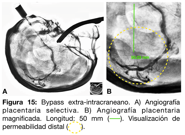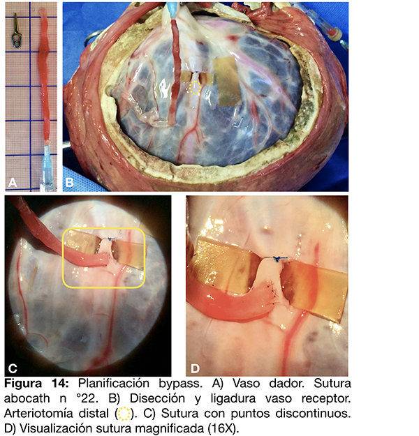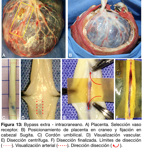 Se diseñó un bypass extra-intracraneano seccionando un vaso arterial del cordón umbilical obtenido por disección filosa. Posteriormente, se suturó a una placenta posicionada en cráneo.
