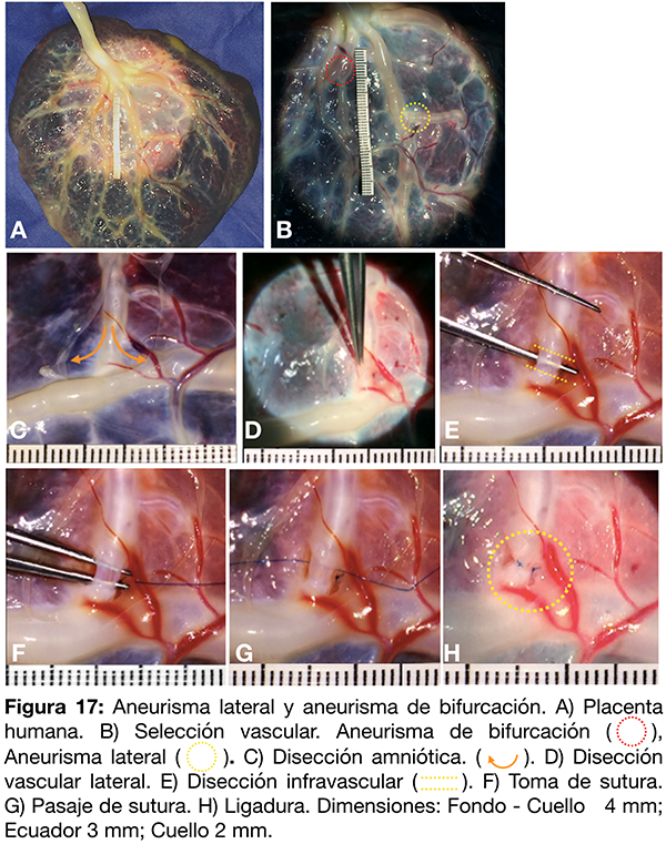 Se seleccionan distintos territorios arteriales de la placenta para la generación de un aneurisma lateral y otro de bifurcación (fig. 17 A-B). Se diseca la membrana amniótica con micro tijera (fig. 17 C). Se diseca en forma filosa la cara lateral vascular y se prosigue con la región infra vascular (fig. 17 D-E). Se practica una ligadura con nylon 8-0 conformando así el aneurisma lateral (fig. 17 F-G-H).