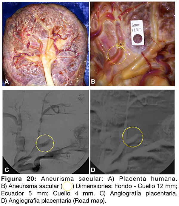 Se selecciona un vaso arterial de la placenta para la generación de un aneurisma sacular (fig. 20 A). Tras disecar la membrana amniótica con micro tijera, se diseca en forma filosa la cara lateral vascular, se continua con la región infra vascular y se practican dos ligaduras con nylon 8-0. Luego se secciona el vaso con micro tijera recta entre ambos puntos conformando el aneurisma sacular (fig. 20 B). A continuación, se cateterizan los vasos arteriales mediante catéter guía 6F y se inyecta contraste diluido al 70% (fig. 20 C-D).