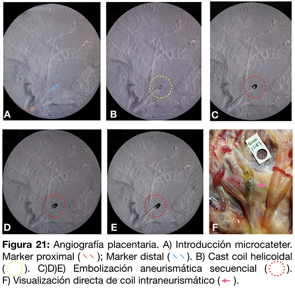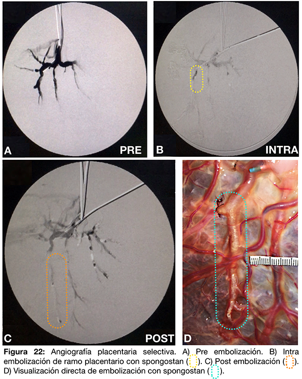 Se cateteriza un vaso arterial placentario con un catéter guía 6F y se inyecta contraste diluido al 70% (fig. 22 A). Se realiza un mapa seco (road mapping sin inyección de contraste previa) y se embolizan desde el catéter guía en forma progresiva los ramos distales utilizando Spongostan® fragmentado en una jeringa de 5ml con contraste al 50% (fig. 22 B-C). Finalmente se observa en forma directa el material de embolización intraarterial (fig. 22 D).